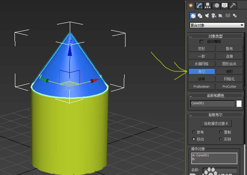 4、在“布尔”的“操作”栏内点选“并集”后,再点中最上面的“拾取操作对象B”按钮,然后再选中另外一个物体即可。该方法可以将两个模型完整的合并为一个物体。