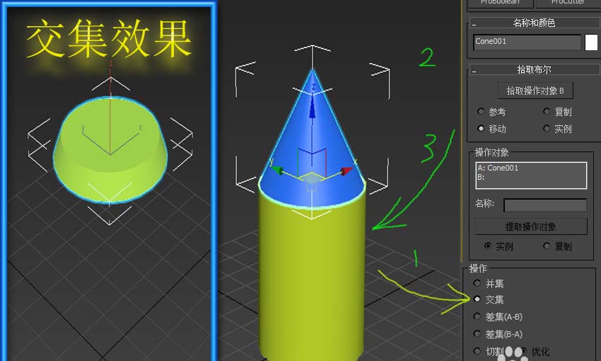 5、事实上,“布尔”合并物体的功能是比较完善的,在“操作”栏内的其它选项则可以实现其它合并功能。“交集”可以实现只合并两个模型相交融的部分。