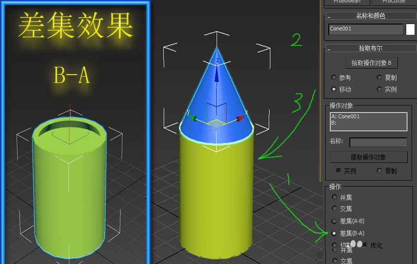 6、”差集“则是常用的去掉两个物体的接触部分,并将其中的一个物体去除,而去除哪一个物体则取决于是选择了”A-B还是”B-A“。