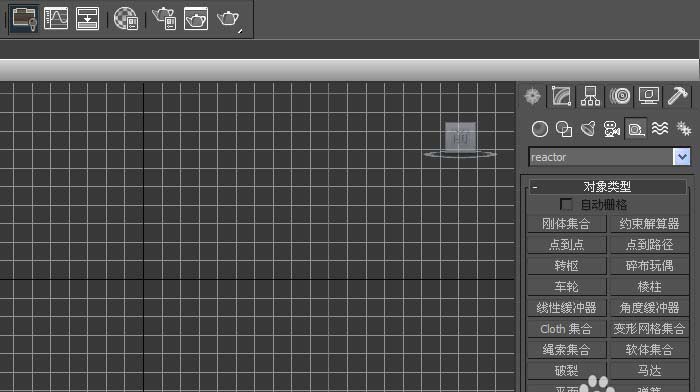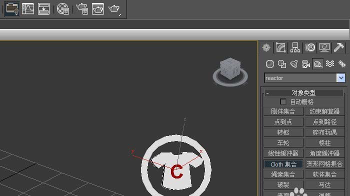 2、在【reactor对象】的面板上,鼠标左键单击【cloth集合对象】,接着在透视图中,拖动绘制cloth集合对象出来,如下图所示。