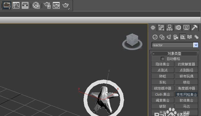 1、打开3d max软件(这里用的3d max2010版的软件)。可看到四个视图窗口,在窗口的右边,鼠标左键单击面板的【辅助对象】按钮,选择【reactor对象】,如下图所示。
