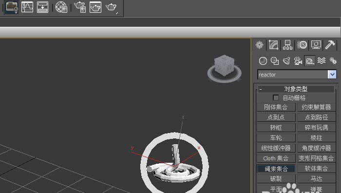 4、在【reactor对象】的面板上,鼠标左键单击【绳索集合对象】,接着在透视图中,拖动绘制绳索集合对象出来,如下图所示。
