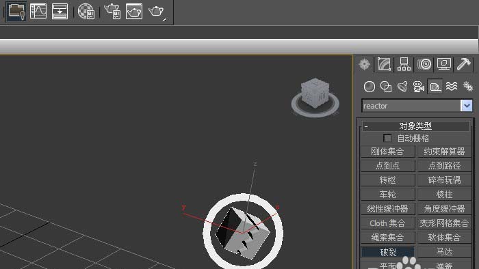 6、在【reactor对象】的面板上,鼠标左键单击【破裂集合对象】,接着在透视图中,拖动绘制破裂集合对象出来,如下图所示。