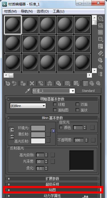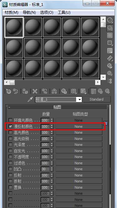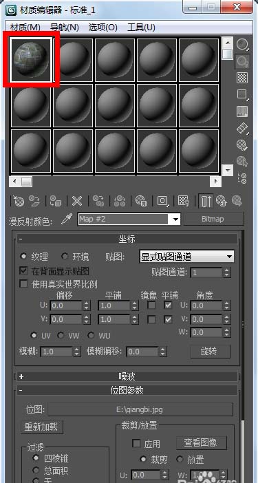 3、如图,使用快捷键“M”,打开“材质编辑器”,选中第一颗材质球
