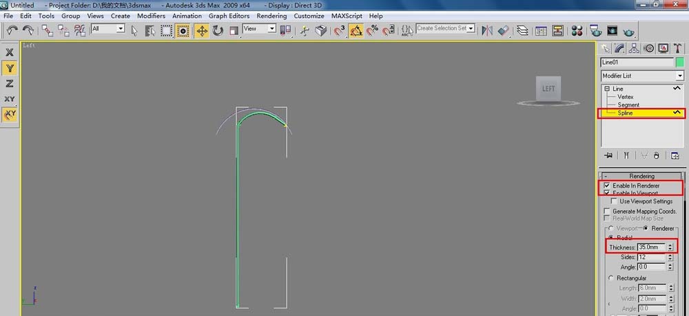 5、在左视图中绘制如图的线形,修改渲染卷展栏下的厚度值为35mm,作为支架。