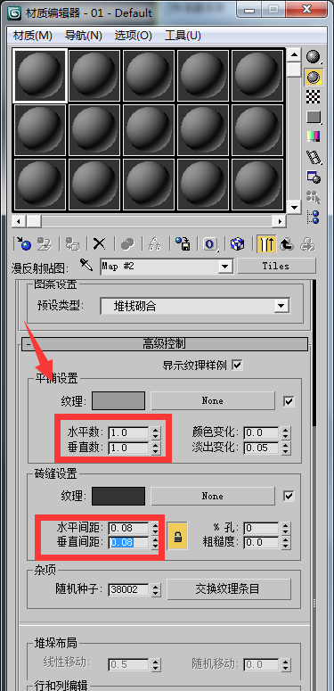 5、选择平铺里面的高级控制,设置里面平铺设置,设置成水平1竖直1,砖缝根据实际需要调节大小,我这里设置0.08