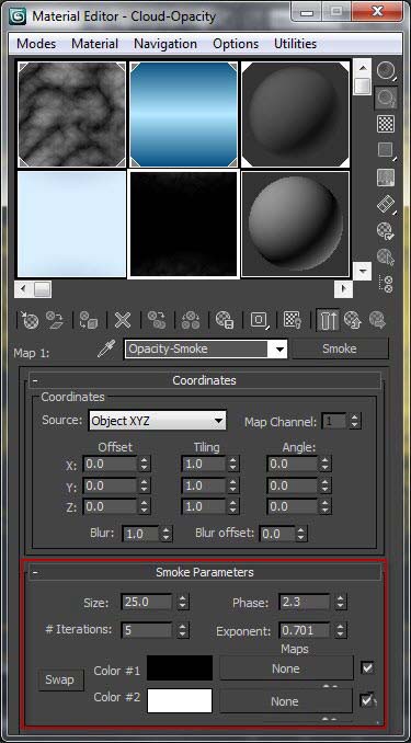 3、按M打开材质编辑器,创建smoke,并将其命名为Displace Plne。将大小设置为74,迭代到20和指数0.9。