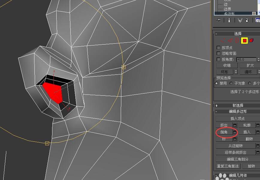 11、选择鼻孔位置的“多边形”,并进行“倒角”操作,参数自己调整至合适位置。