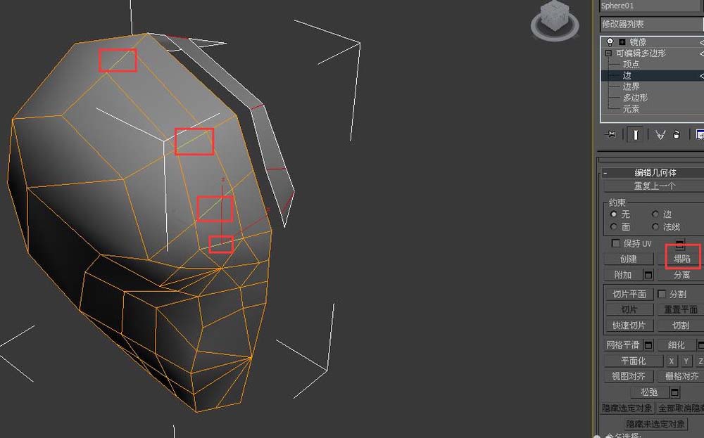 13、在本例中,如图绘制,在头顶部的布线会感觉比较多,这种情况下,我们可以对选择红框标注的线段后进行“塌陷”,这样,两条线就变成一条线了。