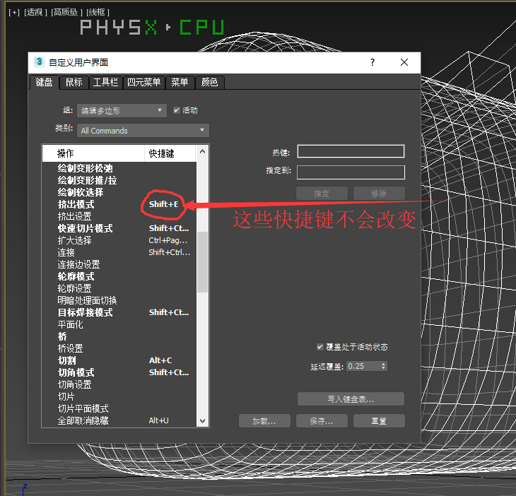 5、但是,3Ds Max自带的一些操作仍然使用自己原有的快捷键。比如挤出操作的快捷键仍是shift+E