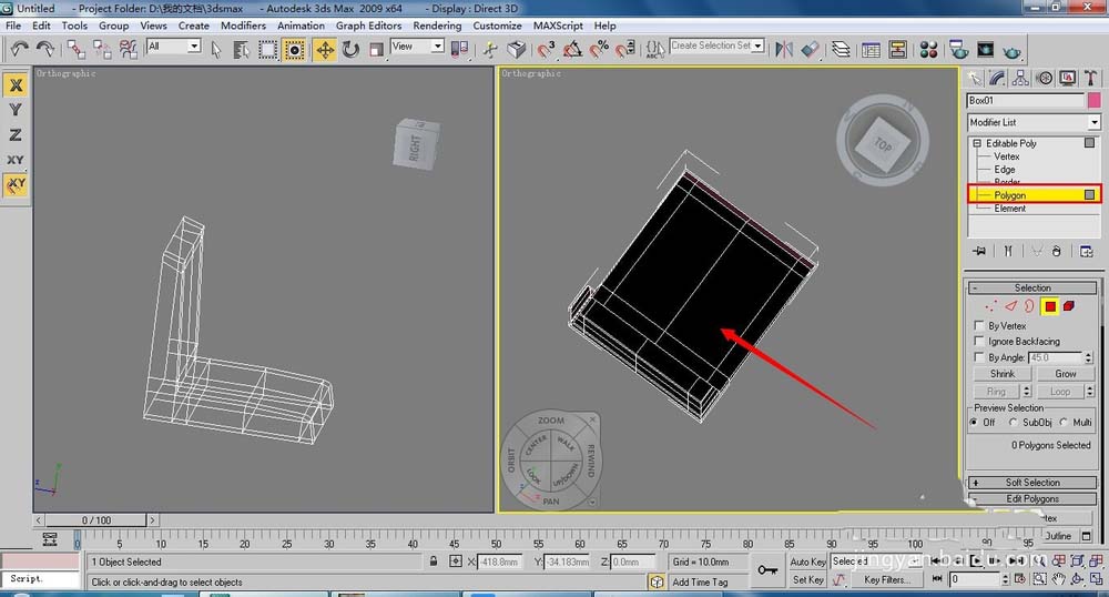 2、将长方体转换为【Editable Poly】(可编辑多边形)按下4键,进入(多边形)层级,在透视图中选择侧面的面,单击【Extrude】(挤出)右侧的小按钮,设置挤出高度为50,单击【OK】按钮。