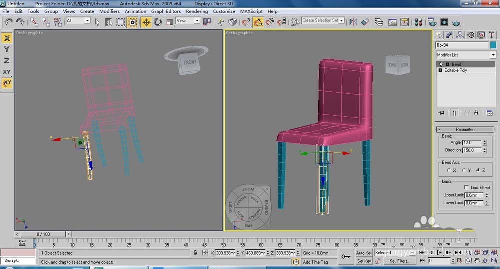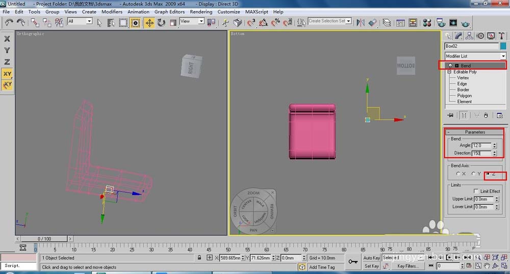 11、在修改器列表中执行【Bend】(弯曲)命令,设置【Angle】(角度)为12,【Direction】(方向)为150,如图。