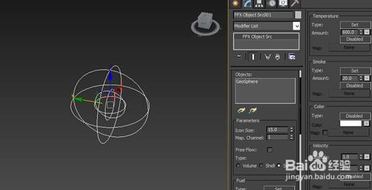 2、创建FumeFX对象源,添加对象,请转到创建面板>帮助程序> FumeFX>对象Src。 单击此按钮并将其拖动到视口中, 现在转到“修改”面板, 将对象类型更改为实体。 设置温度:600.0,烟雾:20.0,并保持其他参数。