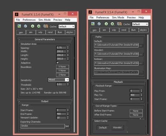 5、完成Obj / Src部分的设置后,我们已经设置了间距的常规参数:0.75,宽度:200,长度:200和高度:300。继续输出范围,设置开始帧:0,结束帧:400,转到 路径,设置FXD文件(缓存文件)路径:单击默认路径旁边的按钮,并根据您的文件夹结构设置路径。 现在前进到播放范围并设置播放从:0和播放到:400.