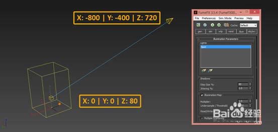 8、完成颜色设置后,给场景添加光。 转到创建面板,然后选择灯光>标准>目标点。 单击目标聚光灯并在视口中创建。 现在将光源位置设置为X:-800,Y:-400,Z:720.将其目标位置设置为X:0.0,Y:0.0,Z:80.0。 现在选择光,进入修改面板,打开阴影并将其设置为光线跟踪阴影。 然后转到阴影参数,打开大气阴影。 完成这些设置后,返回FumeFX容器,然后转到照明部分,并通过单击“选择光源”按钮将此光添加到“灯光”部分。