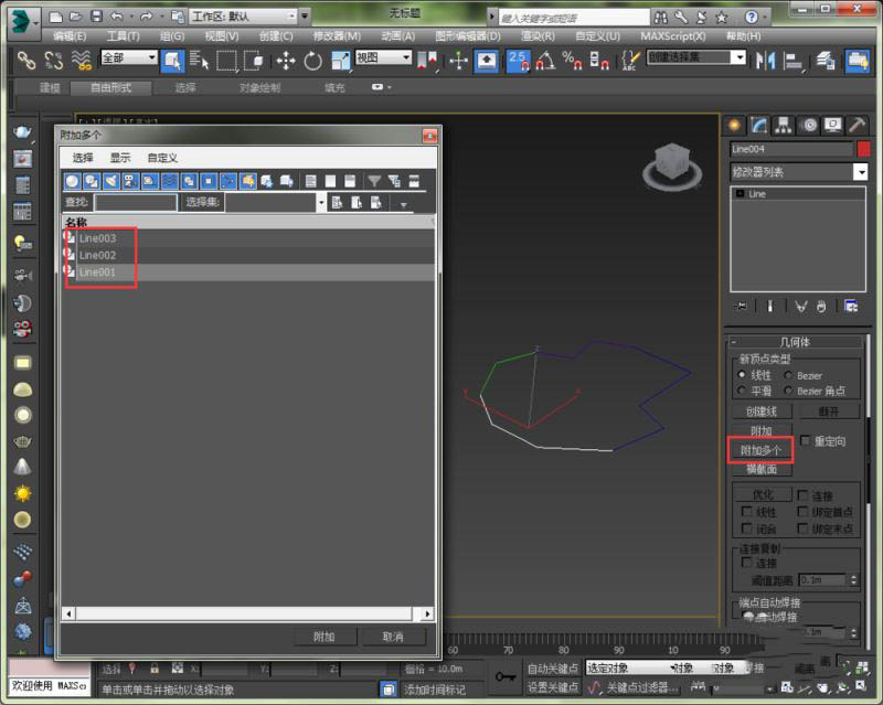 3、在右边的修改面板下拉,找到附加。将几条线附加在一起。这里用附加多个,直接将另外三条线选择。也可以用附加,然后在图上一条一条线选择,根据自己喜好和方便程度定。