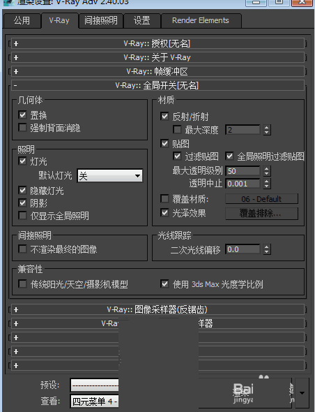 2、找到V-RAY:Global switches 再找到Meterials其中有一个Max depth.将它勾选即可。