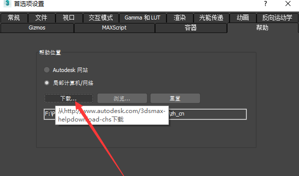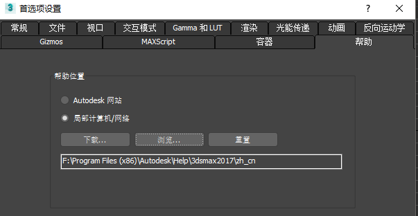 5、安装结束后,回到3DS MAX,再次来到首选项设置的帮助面板,点击浏览按钮,浏览到 ...\Programs Files(x86)\Autodesk\Help\3dsmax2017\zh_cn这个路径。