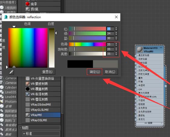 3、双击拖拽出的材质,进入材质编辑面板,单击反射菜单后的颜色块,调整色调、饱和度、亮度分别为“35,35,35”,单击确定按钮;