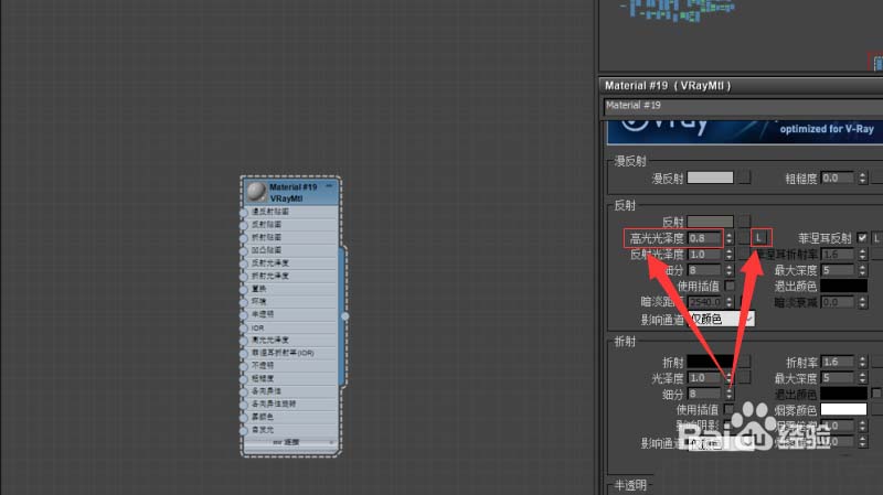 4、单击高光光泽度后的“L”按钮,使高光光泽度可用,调整参数为0.8;