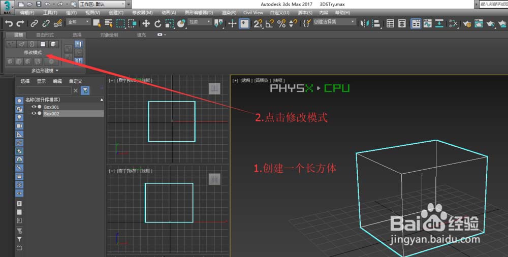 1、首先从右边创建工具选择长方体,创建一个。(上面的石墨建模工具面板保持打开和固定状态),点击修改模式按钮,会自动添加可编辑多边形修改器。