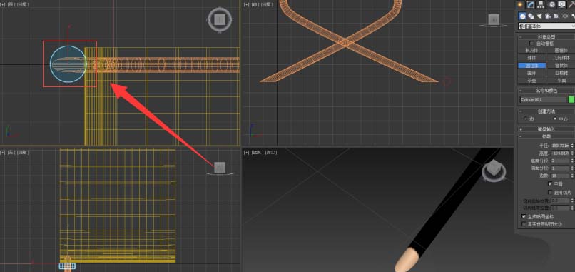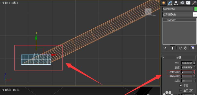 6、使用“圆柱”命令,在顶视图绘制出圆柱,设置高度分段并移动位置,将其转换为可编辑网格;