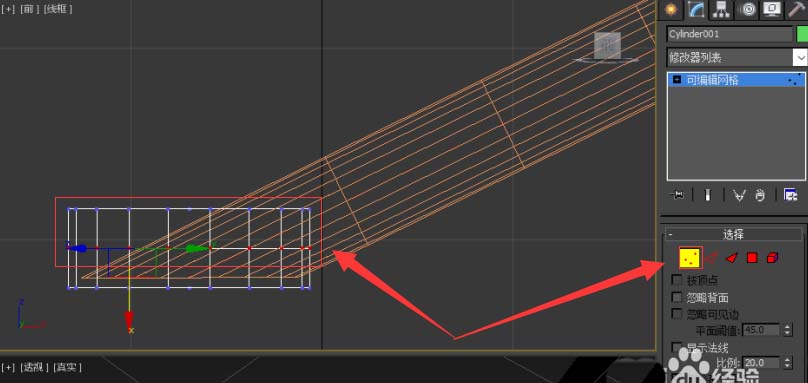7、选中圆柱,在修改器面板下进入“点”子物体级别,对其进行调整;
