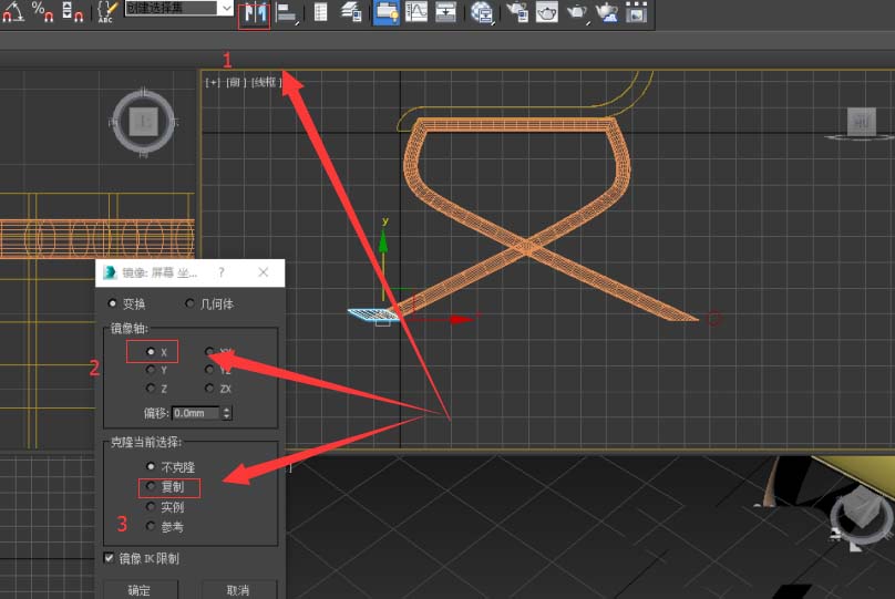 8、单击“镜像”菜单,在弹出的菜单中修改“镜像轴”,选择“复制”选框,并将复制的垫子对准位置移动到另一侧,;