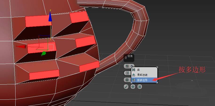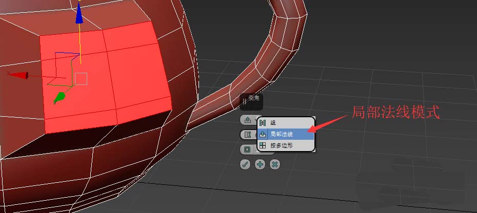 3、当对多个多边形进行倒角时,倒角命令可以选择模式。如下图,是倒角命令的三种模式:组/局部法线(合并),多边形(分离)
