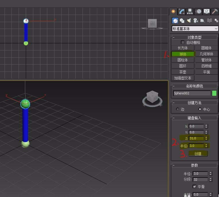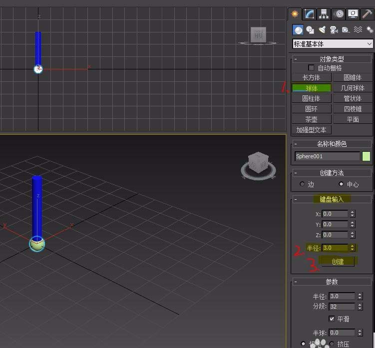 3、标准基本体-对象类型,选择球体,手动输入参数半径和物体Z轴位置(如图所示),点击创建