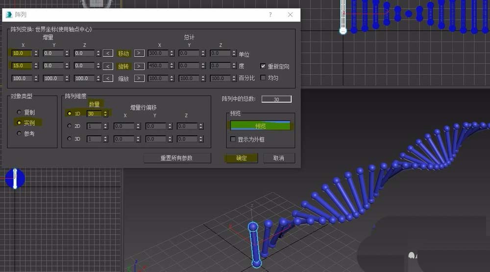 6、工具-阵列,更改阵列参数:移动 x 填入10,旋转X 填入15,数量1D 填入30,对象类型使用实列,点击预览查看,可根据需要继续调节参数,完毕后点击确定。