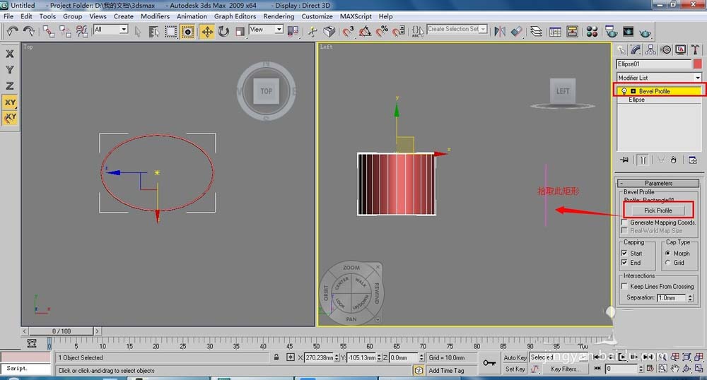 2、选择创建的椭圆,在修改命令列表中选择【Bevel Profile】(倒角剖面)命令,拾取矩形为剖面,得到的效果如图。