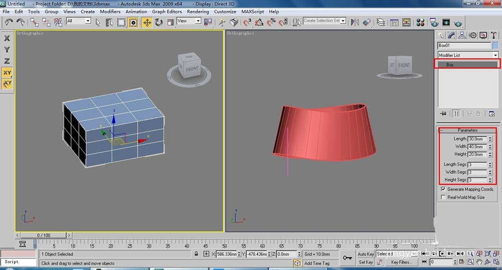 4、在顶视图中创建一个30*40*20的长方形,段数分别为3、3、3,如图。