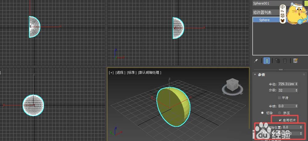 6、如果想画不同方向的半球,也可采取切片的形式,在启用切片前打钩,在设置一定角度即可。