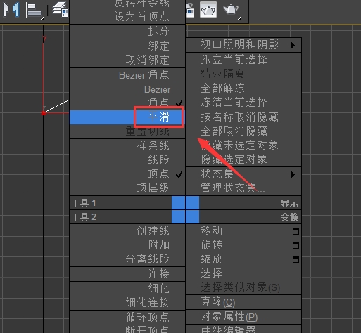 4、选择线在修改里找到点层级,然后选择所有的点单击鼠标左右键在弹出的右键菜单里找到平滑选项,如图所示: