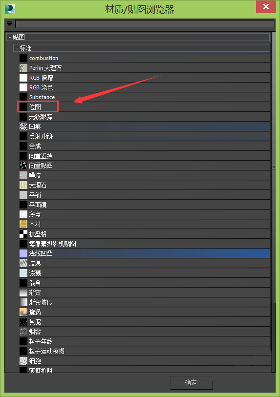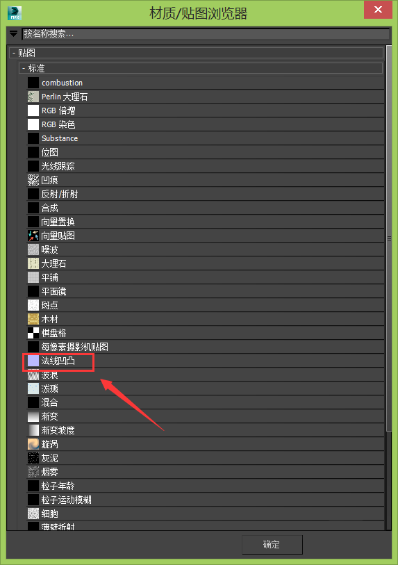 9、点击该选择按钮在弹出的对话框内找到法线凹凸选项,如图所示: