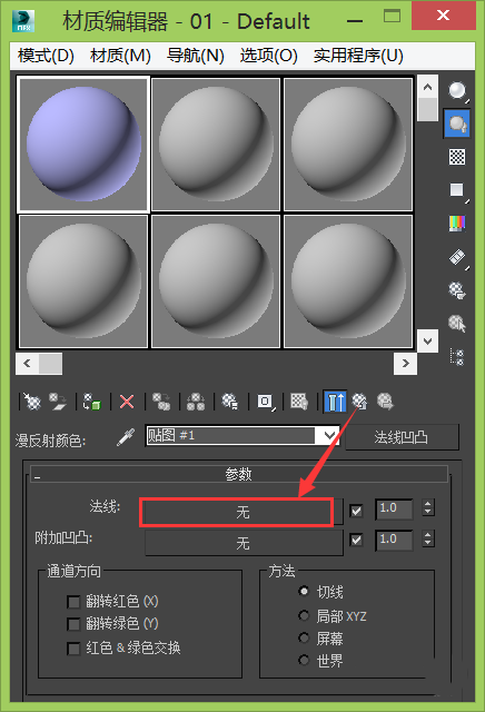 10、点击法线凹凸选项后在设置里找到法线后的无按钮,如图所示: