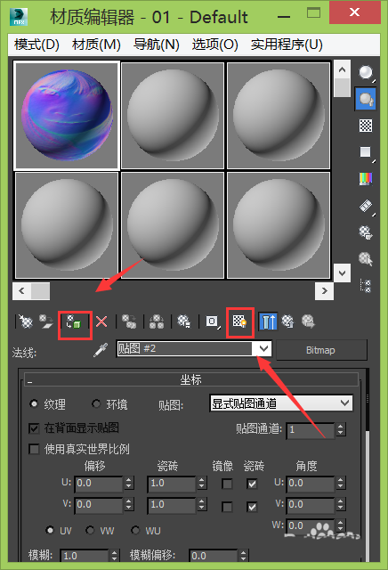 13、选择该图片后在材质编辑器里找到将材质指定给选择的对象选项和视口中显示明暗处理材质选项,如图所示: