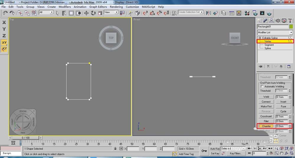 2、执行【Edit Spline】(编辑样条线)命令,按下1键,激活(顶点)层级,选择矩形的所以顶点,在【Geometry】(几何体)卷展栏下【Chamfer】(切角)按钮右侧的文本框中输入5,按Enter键。
