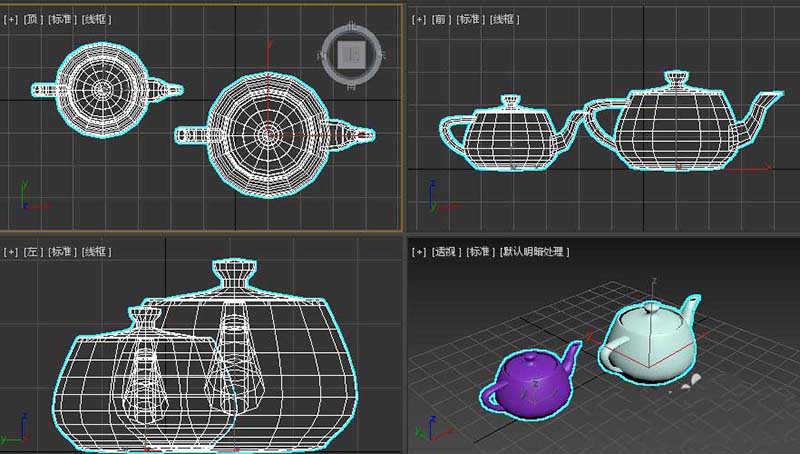 2、当我画好了两个茶壶,对其中一个在前视图进行缩放操作,选择该茶壶,点击缩放工具。