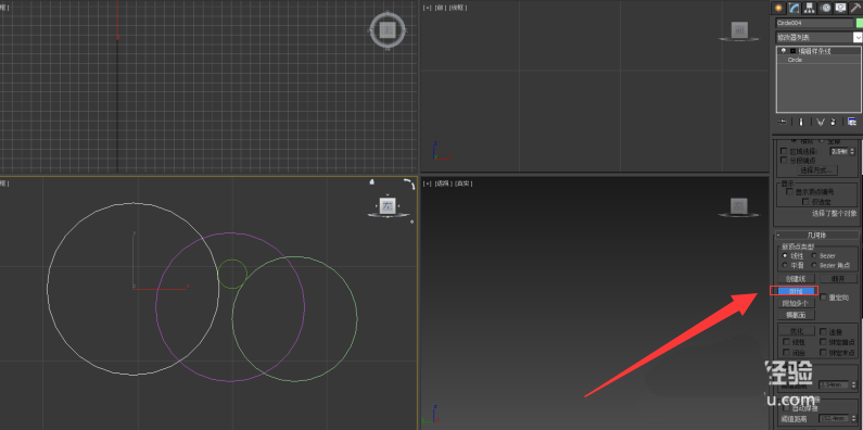 3、选中其中的一个圆,在修改器列表下选择编辑样条线命令,在下拉菜单栏中选择“附加”工具,将所有圆附加为一体;