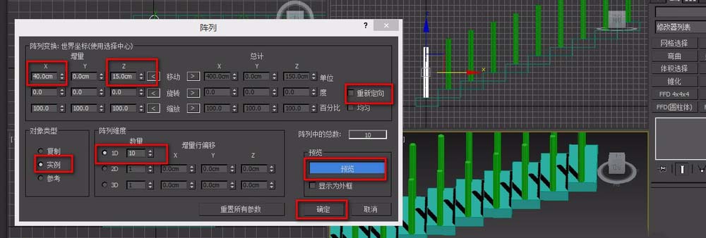 6、按住CTRL选择两根柱子,然后阵列,使每个阶梯上都有柱子。