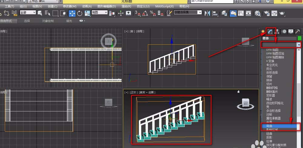 12、选择x弯曲轴,角度和和方向都为90,就可以成功的做出一个弯曲的楼梯了,一般而言,弯曲的方向不同,它所显示的样子也是不同的,要具体根据的坐标轴来确定,也就3个方向,可以一个个的测试出来。