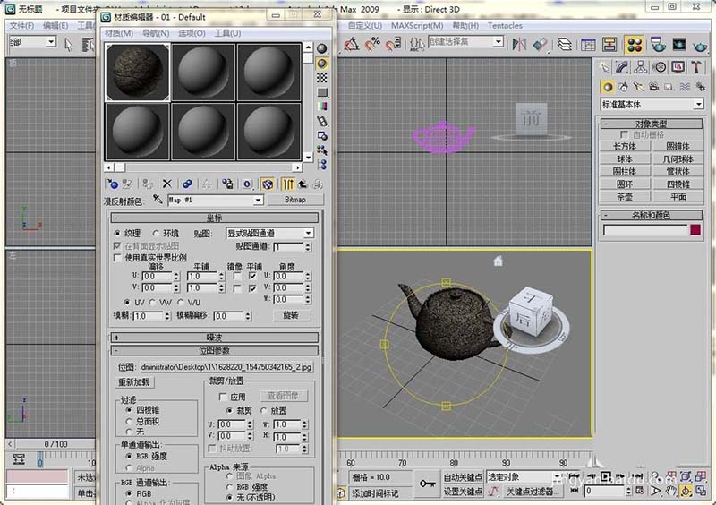 6、这个时候这个岩石图片就加载到了3dmax中,然后把它赋予这个茶壶吧。我们发现茶壶就被变成了岩石茶壶了。