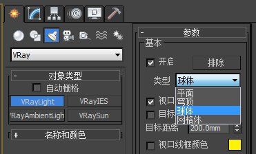 2、点击VRayLight,将灯光类型修改为球体