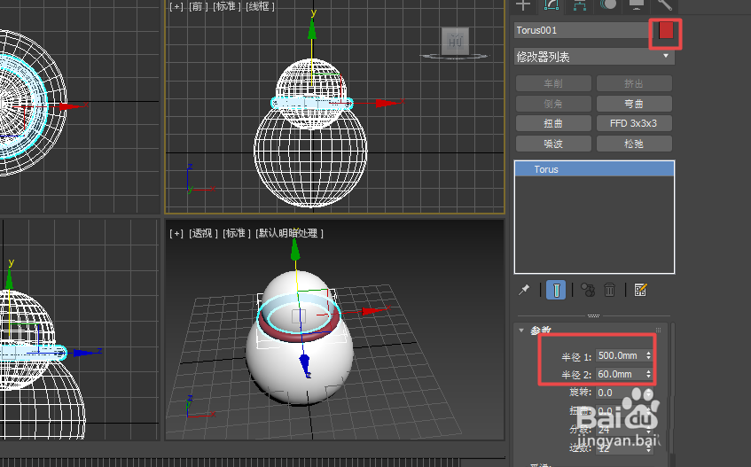 3、然后再创建一个圆环,设置半径1为500mm,半径2为60mm,用移动工具将它移动到大球和小球之间,将颜色设置为红色,作为雪人的围巾。