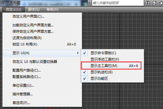 然后选择“显示UI”,点击“显示主工具栏”,这样主工具栏就会恢复在3ds Max的界面了。