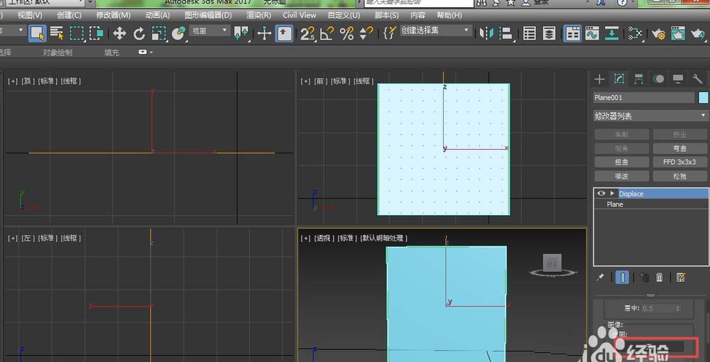 5、然后在置换下面,将强度改为一定值,会发现平面变成凹凸不平的形状。