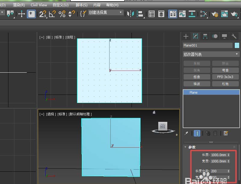 1、首先打开3dmax,在创建下找到平面,绘制一个1000*1000的平面,设置分段数为200*200.