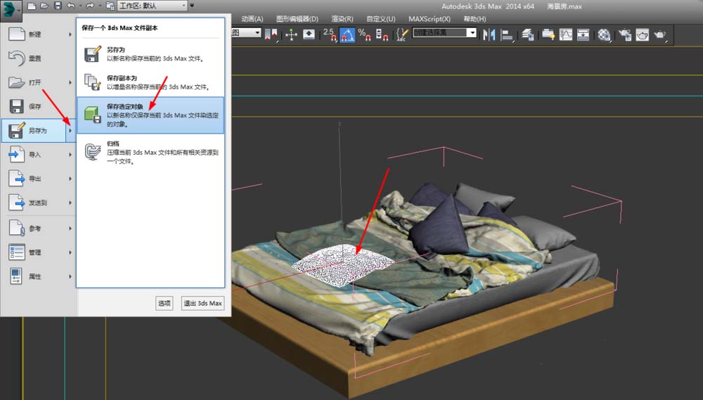 3、再次选择抱枕,然后点击3dsmax图标,在左边的另存为中选择保存选定对象